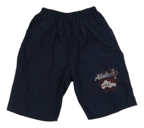 Tmavomodré plátěné kraťasy s autem a nápisem