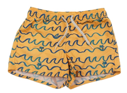 Oranžovo-tmavomodro/modrozelené plážové kraťasy s vlnkami a palmami