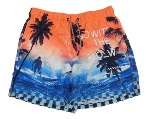Růžovo-modré plážové kraťasy s palmami a nápisem