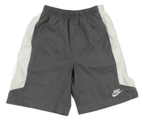Tmavošedé šusťákové sportovní kraťasy s bílým pruhem a logem Nike