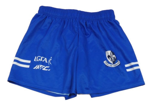 Modré sportovní kraťasy s pruhy a nápisy