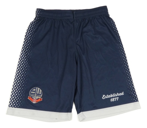 Tmavomodro-bílé sportovní fotbalové kraťasy se znakem a vzorem