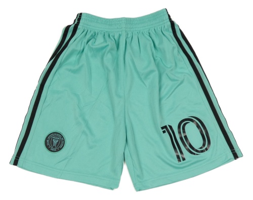 Mentolovo-černé sportovní fotbalové kraťasy se znakem a číslem a pruhyů