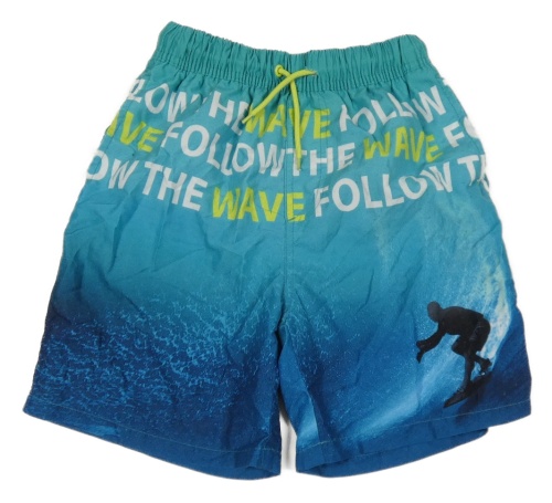 Modrozeleno-petrolejové plážové kraťasy s nápisy a surfařem