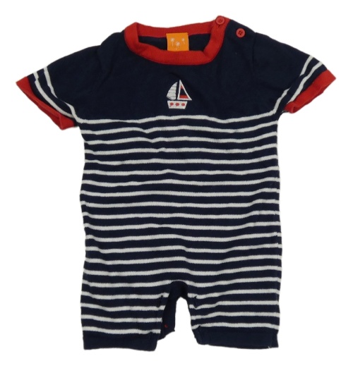 Tmavomodro-bílý pruhovaný pletený kraťasový overal s plachetnicí