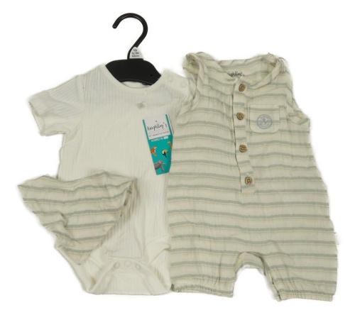 • Nové - 3set - Světlebéžovo-zelený pruhovaný mušelínový kraťasový overal + smetanové žebrované body + slinták