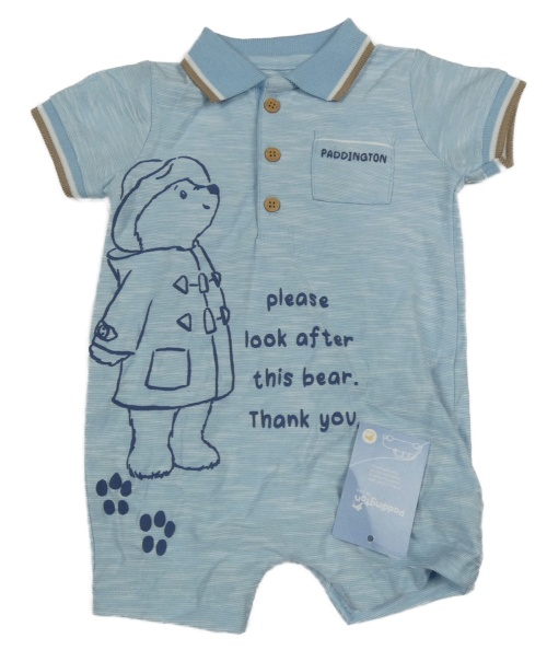 • Nové - světlemodrý melírovaný kraťasový overal s medvídkem Paddington a llímečkem George