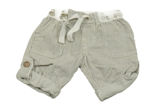 Hnědo-bílé pruhované plátěné kraťasy s traktory