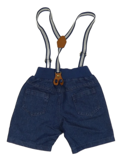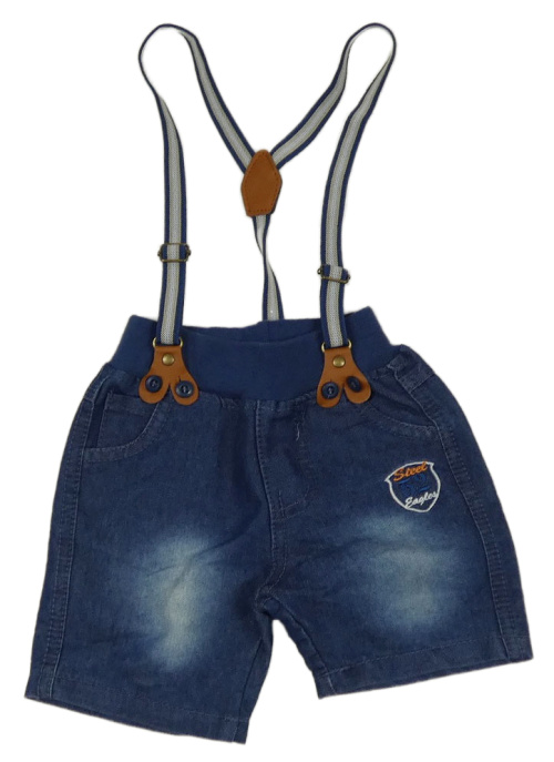 Modré teplákové riflové kraťasy se znakem s číslem a nápisy a kšandami