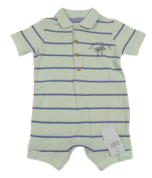 Nové - mátovo-fialovo-tmavopetrolejový pruhovaný kraťasový overal s palmami a nápisem a límečkem George
