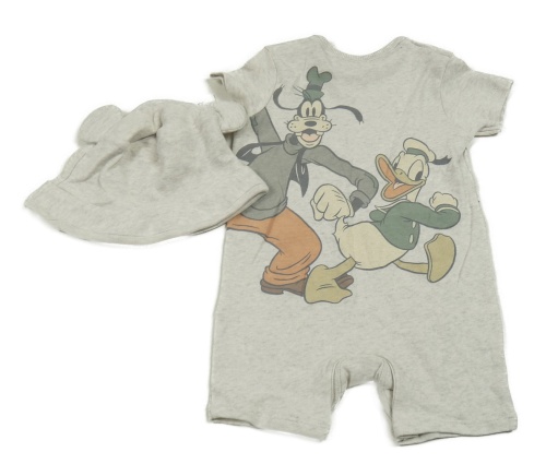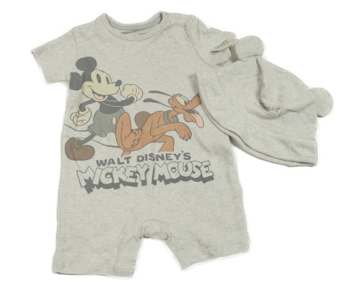 • Nové - Světlešedý melírovaný bavlněný kraťasový overal s Mickeym a přáteli + bavlněná čepice George