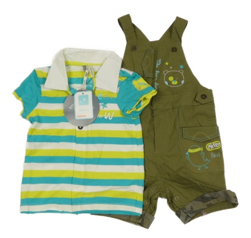 Nové - 2Set - Khaki plátěné laclové kraťasy s medvídkem + pruhované propínací tričko s nápisy a límečkem Orchestra Bébé
