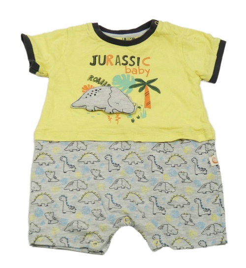 Žluto-šedý vzorovaný kraťasový overal s dinosaury