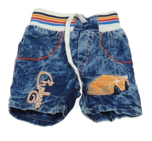 Tmavomodré plísňové plátěné kraťasy s autem a úpletovým pasem