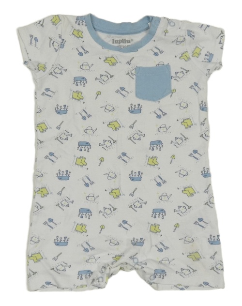 Bílo-světlemodrý kraťasový overal se zahradnickými obrázky a kapsou lupilu