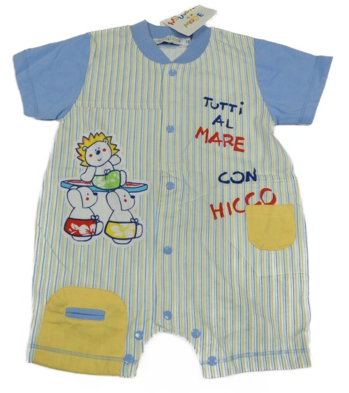Nové - Bílo-modro-žlutý pruhovaný kraťasový overal se zvířaty a nápisem