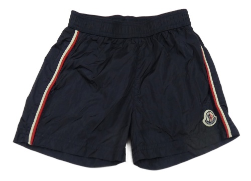 Tmavomodré šusťákové kraťasy s nášivkou a pruhy Moncler