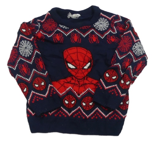 Tmavomodro-červený vzorovaný svetr se Spidermanem