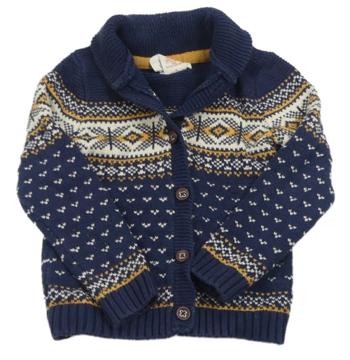 Tmavomodro-bílo-hořčicový vzorovaný propínací svetr