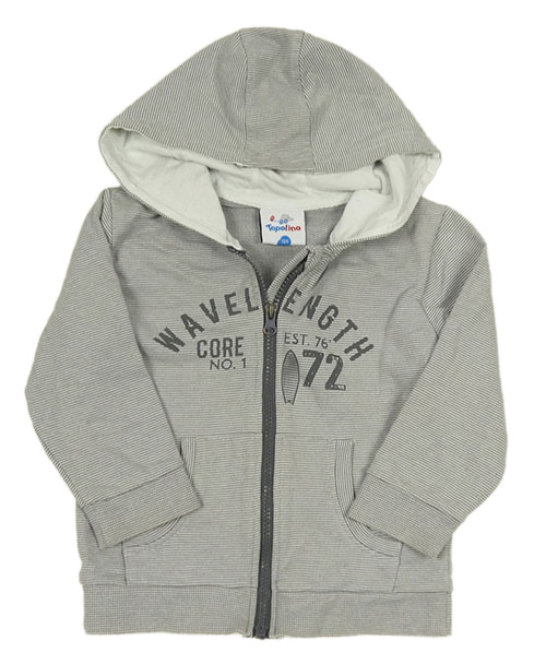 Šedo-bílá pruhovaná propínací mikina s nápisy a číslem a surfem a kapucí Topolino