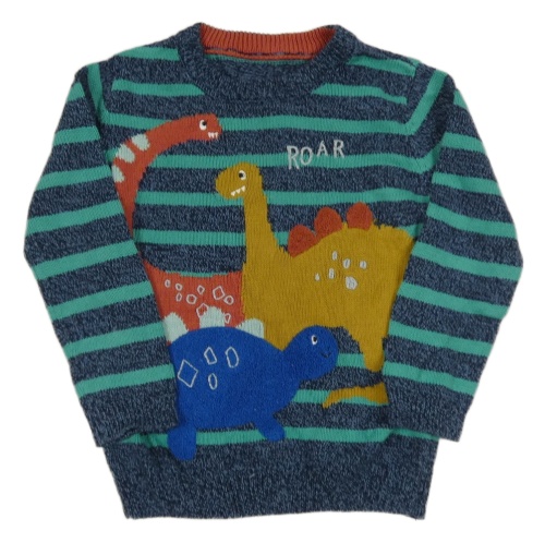 Tmavomodro-tyrkysový pruhovaný svetr s dinosaury Nutmeg