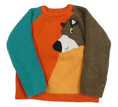 Červeno-oranžovo-modro-hnědý svetr s medvědem Dunnes