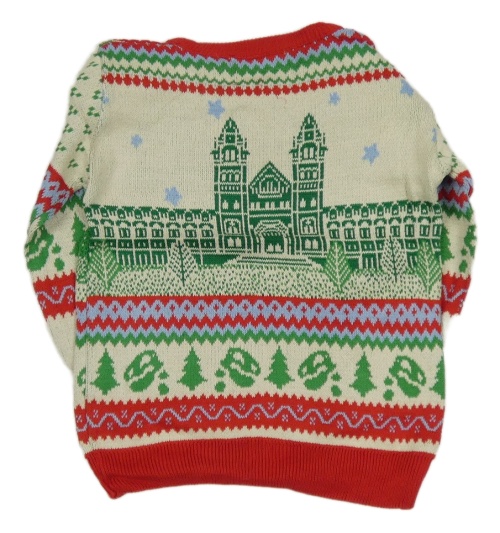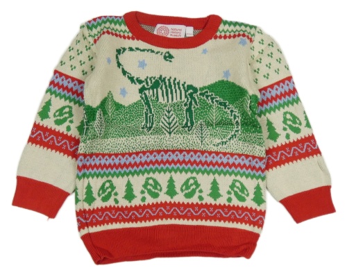 Krémovo-zeleno-červený vzorovaný svetr s kostrou dinosaura