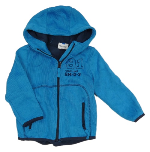 Modrá pletená podšitá propínací mikina s číslem a kapucí Topolino