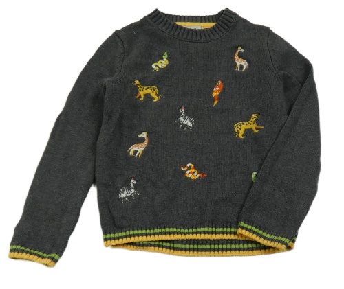 Tmavošedý svetr se zvířaty a žlutým lemem