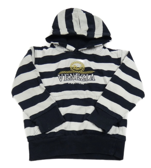 Tmavomodro-bílá pruhovaná mikina s nápisem a kapsou a kapucí Venice