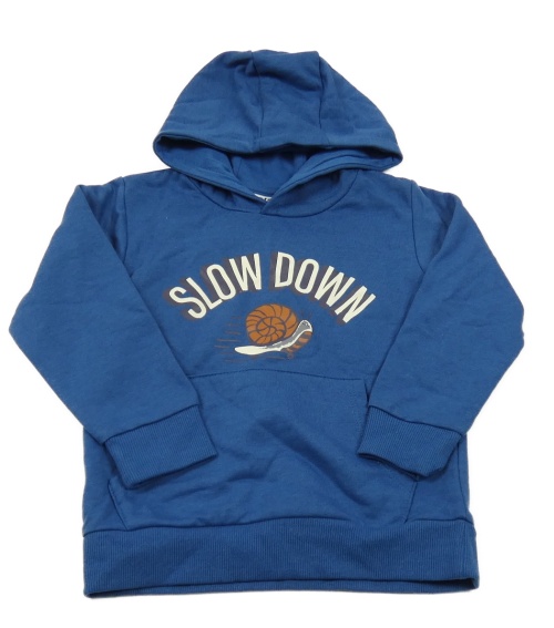 Tmavomodrá mikina s nápisem, šnekem a kapucí
