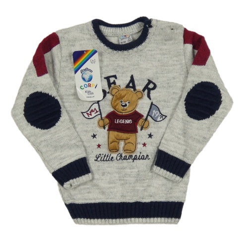 Nové - světlešedo-tmavomodro-vínový melírovaný vlněný svetr s medvídkem