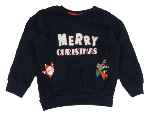 Tmavomodrá vánoční mikina s nápisy a Santou a sobem a kapsou little kids