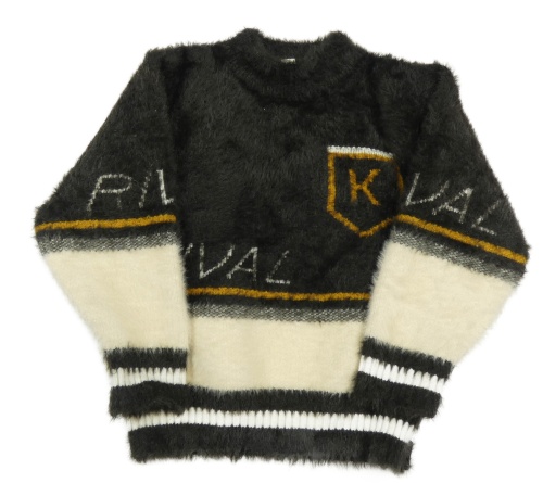 Černo-smetanový chlupatý svetr s nápisy a erbem
