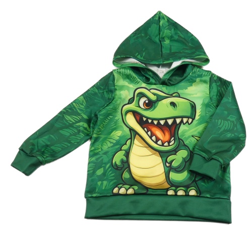 Zelená mikina s dinosaurem a kapucí