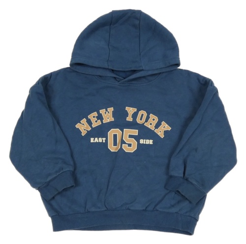 Modrá mikina s nápisem a kapucí