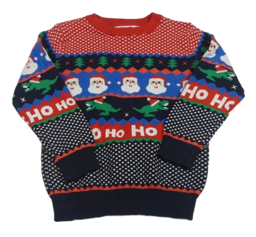 Tmavomodro-červeno-modrý vzorovaný svetr se Santy a dinosaury F&F