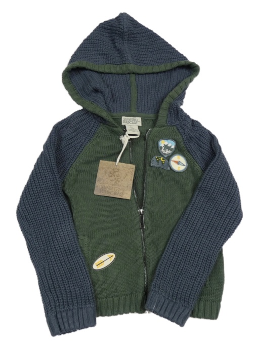 Nové - khaki-tmavomodrý žebrovaný propínací svetr s nášivkami a kapucí MiNiSTRY of RaSCaLS