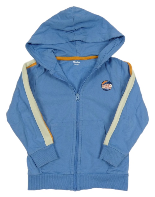 Světlemodrá propínací mikina s pruhy na rukávech a kapucí