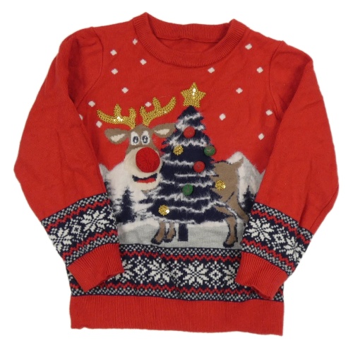 Červený pletený svetr se sobem a stromkem Dunnes Stores
