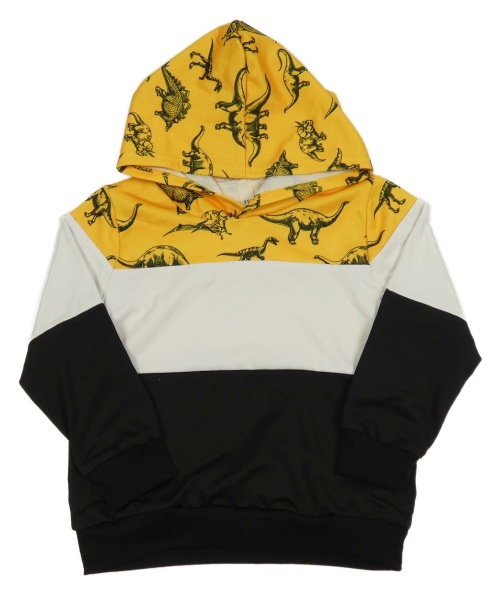 Žluto-bílo-černá sportovní mikina s kapucí a dinosaury