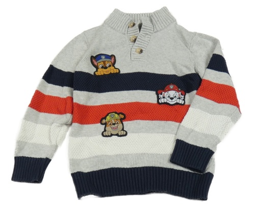 Šedo-tmavomodro-červeno-bílý melírovaný svetr s PAW PATROL a pruhy C&A