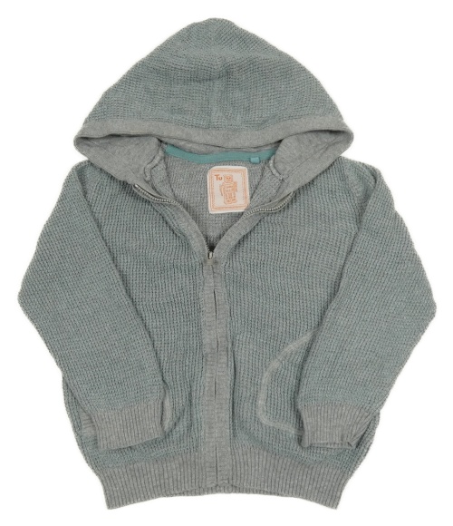 Šedo-tyrkysový propínací svetr s kapucí Tu