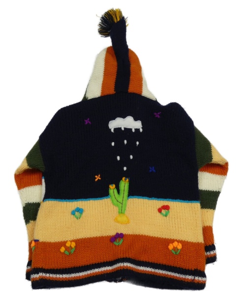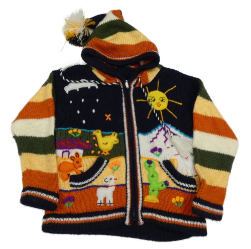 Tmavomodro-vanilkovo-khaki-oranžový propínací svetr se zvířátky a kapucí s bambulí