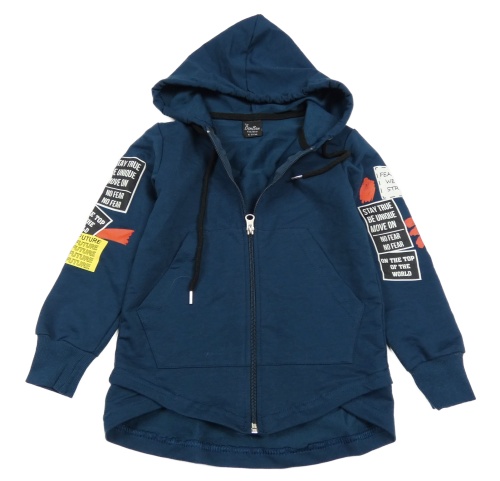 Tmavopetrolejová propínací mikina s nápisy a kapucí