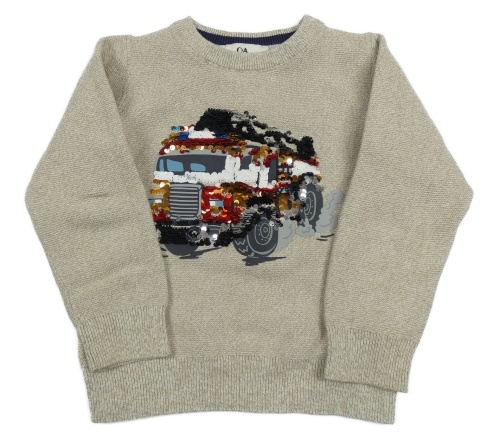 Béžový svetr s hasičským autem z překlápěcích flitrů C&A