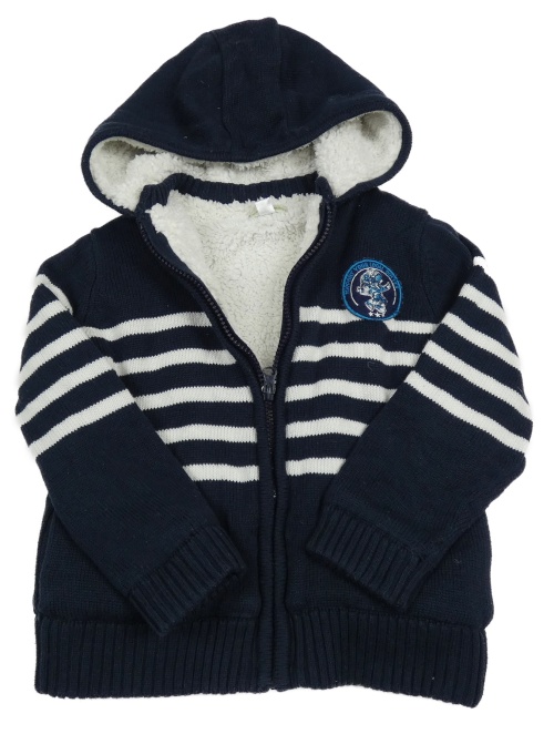 Tmavomodro-bílý pruhovaný propínací zateplený svetr s nášivkou a kapucí Vertbaudet