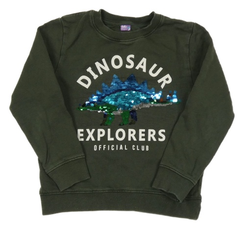 Tmavokhaki mikina s dinosaurem z překlápěcích flitrů a nápisy H&M