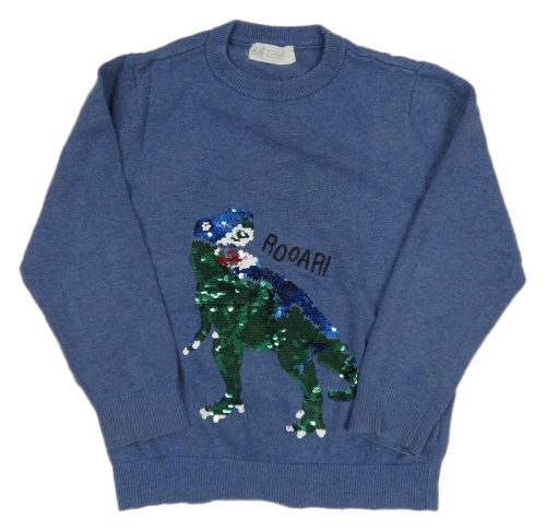 Tmavomodrý melírovaný svetr s dinosaurem z překlápěcích flitrů H&M