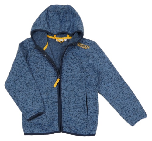 Modrá melírovaná pletená propínací mikina s nápisem a kapucí Kids